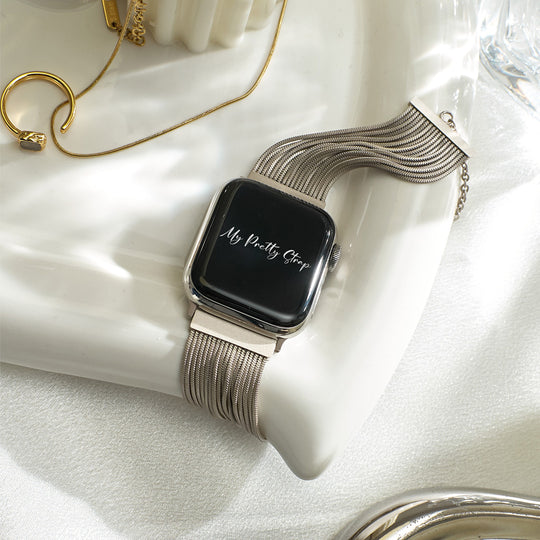 Crafted from premium stainless steel and twisted into elegant woven link chains, this watch band elevates your Apple Watch with its luxurious look & feel. Each watch band comes with its own metal adapter, designed to fit your Apple Watch seamlessly straight from the box.
